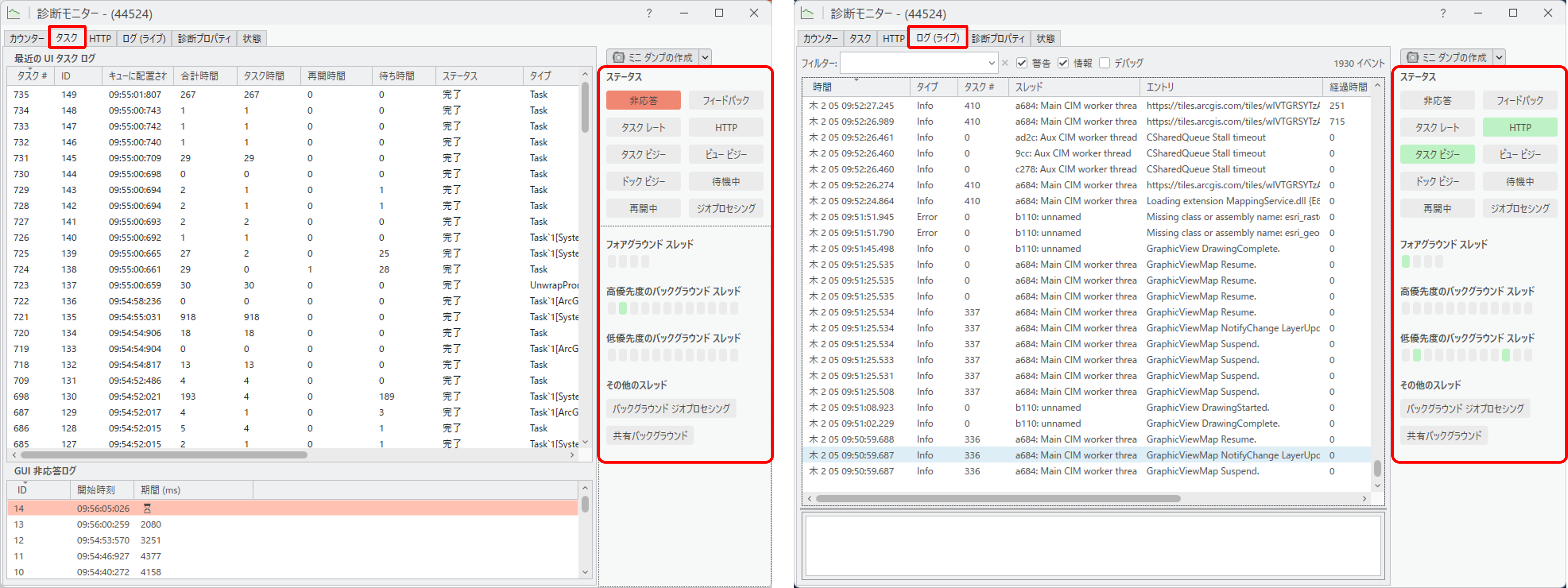 その他、上部にはカテゴリーごとにさまざまなタブが用意されており、例えば [タスク] タブにある [最近の UI タスク ログ] セクションにはタスクの合計時間が表示され、遅延の原因を特定する手がかりとなります。また [ログ] タブでは、現在の ArcGIS Pro セッションにおける全タスクの詳細を確認できます。