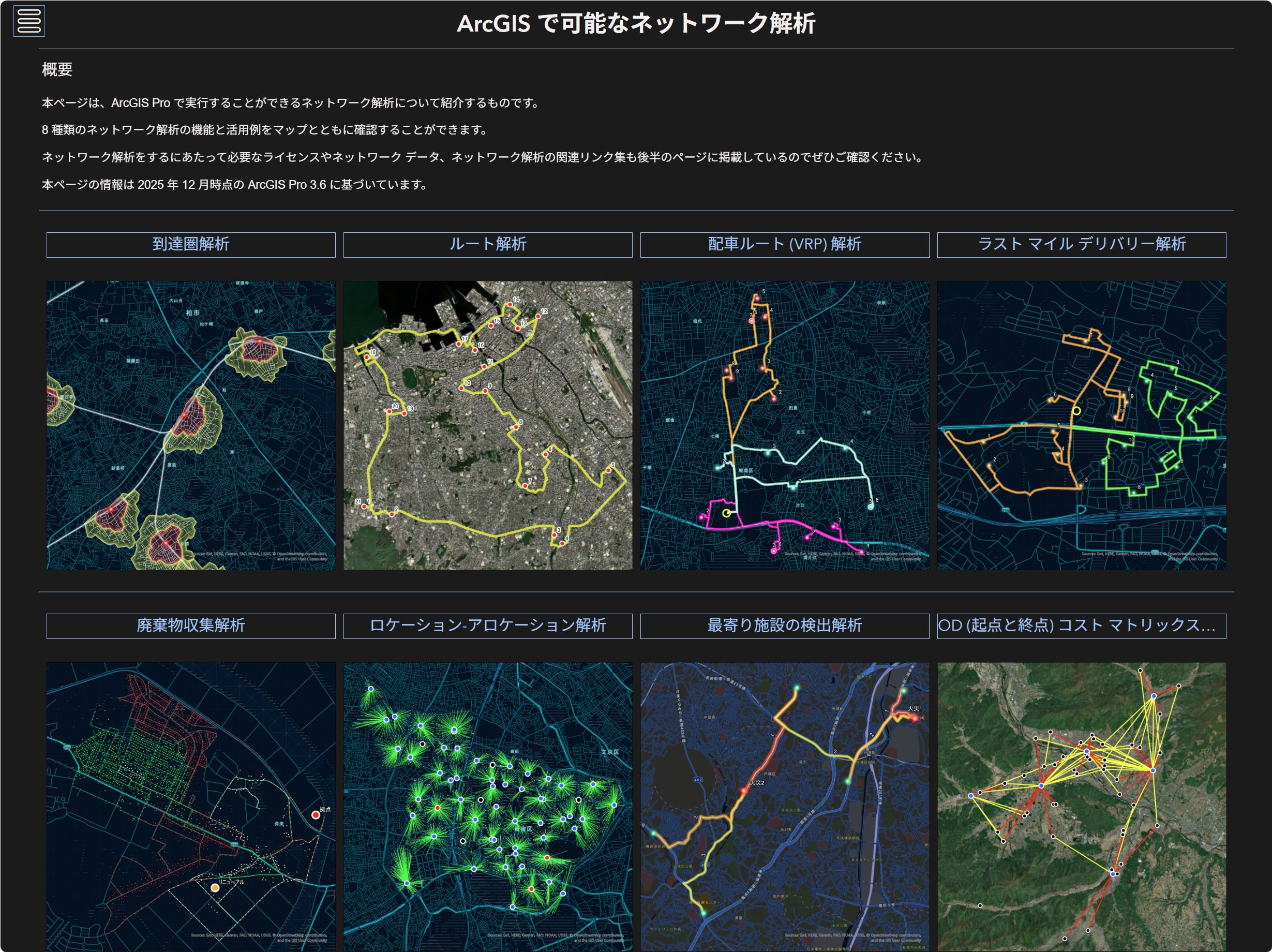 本記事は、ArcGIS Experience Builder で作成した Web アプリ「ArcGIS で可能なネットワーク解析」およびヘルプ ページをもとに作成しています。各解析について、より詳細を知りたい場合は、各ページを併せてご参照ください。