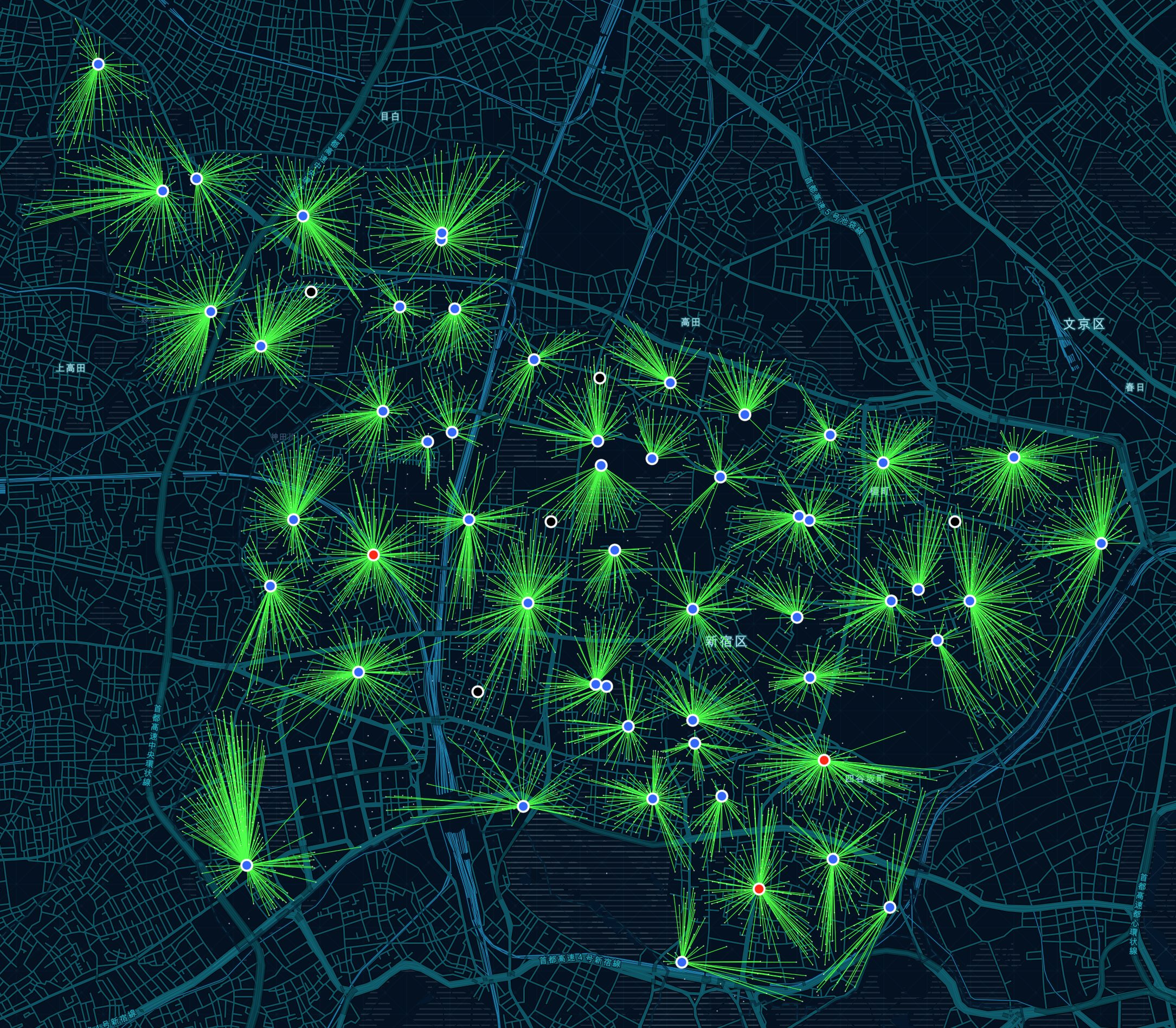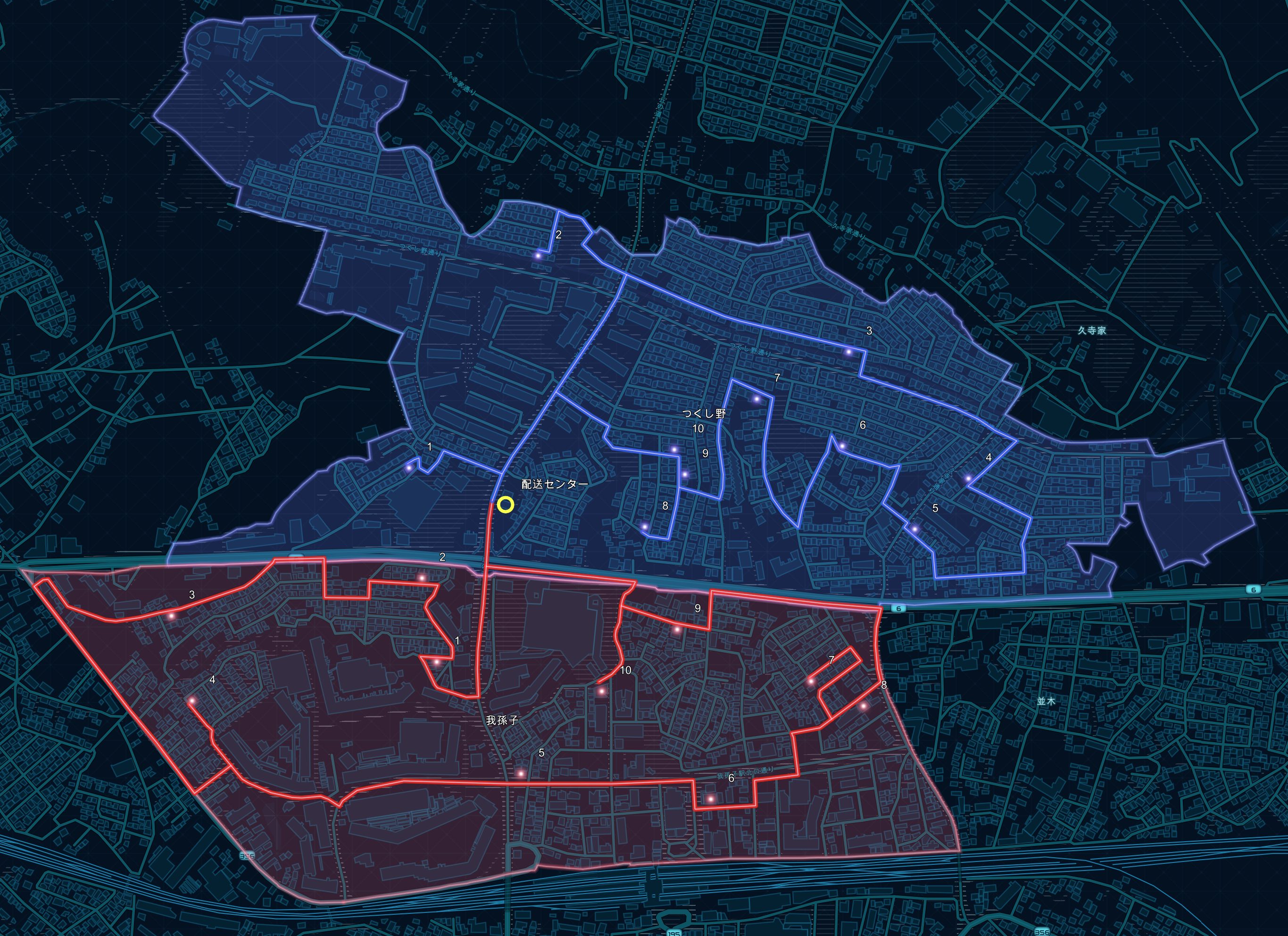 ArcGIS で可能なネットワーク解析のラスト マイル デリバリー解析のページでは、配送の区域に制限を付けずに解析をしたラスト マイル デリバリー解析のマップも掲載しています。