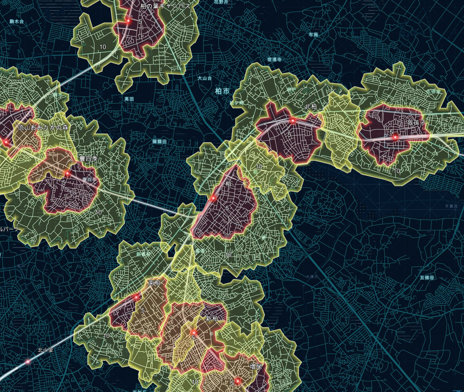 以下の画像では、複数の駅から自転車で 5 分と 10 分の圏域を解析しています。
