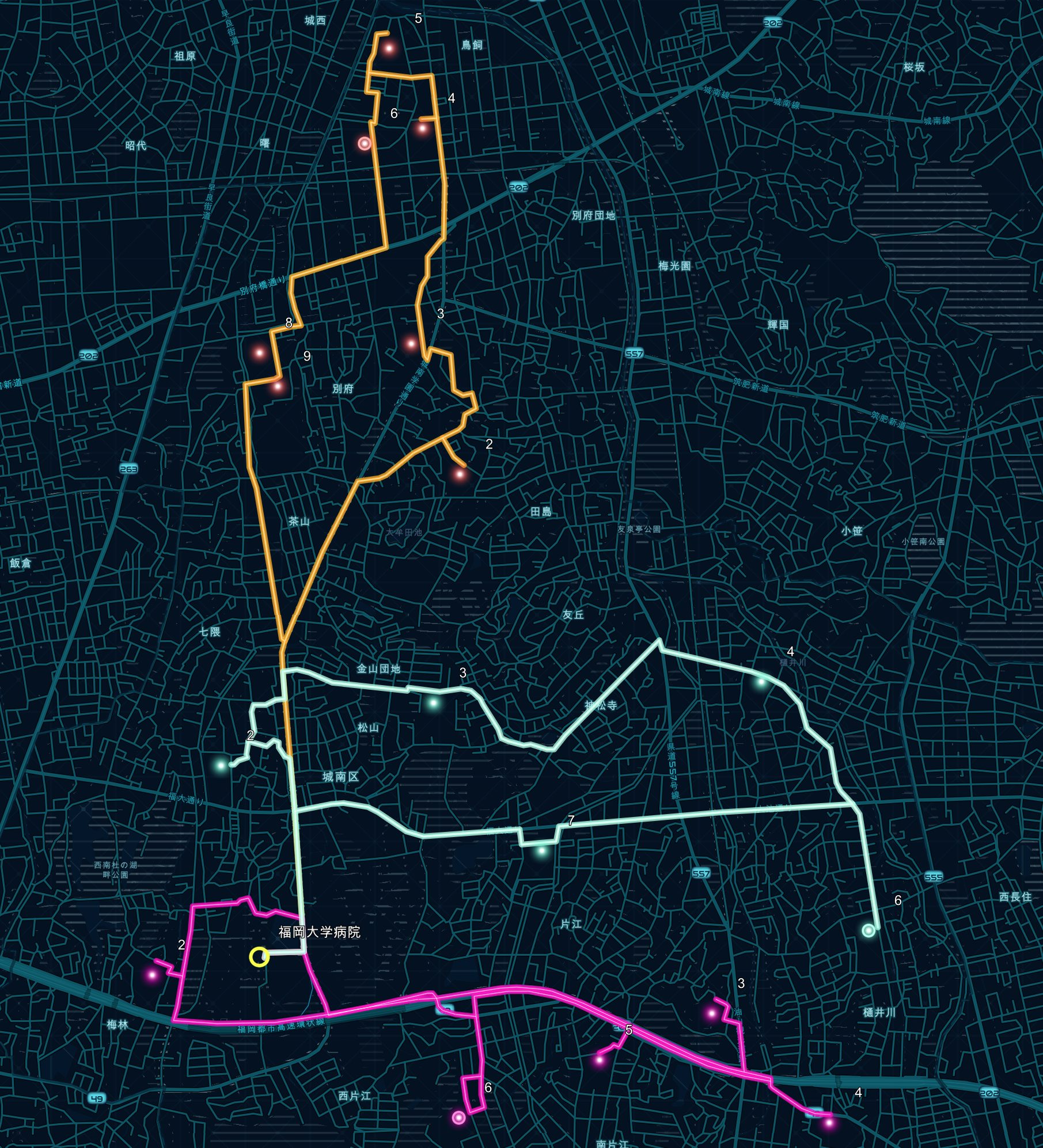 以下の画像では、ある病院を拠点とし、避難所に物資を配送するルートを解析しています。また、積載量に制限を持つ 3 台のトラックが休憩を挟んで巡回するように設定しています。