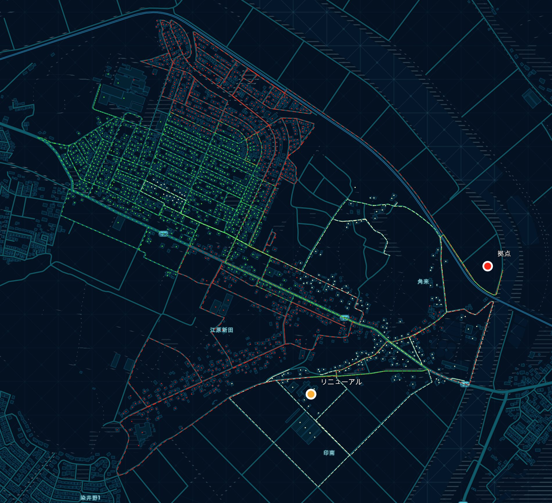以下の画像では、配送センターを拠点とし、複数の車両が住戸まで配達物を届けるルートを解析しています。また、配送区域に制限を付け、一定の区域内で配送する設定をしています。