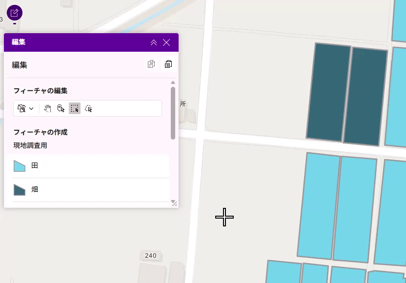 編集ウィジェットでは、フィーチャのコピーと貼り付けに対応しました。コピーした図形は、同じレイヤーにも、同じジオメトリー タイプ (ポリゴン同士など) の別のレイヤーにも貼り付けることができます。同じ形状の図形を繰り返し作図する作業を効率化することができます。さらに、一括編集機能ではフィールドのカスタマイズに対応し、複数の図形に対して必要なフィールドのみをまとめて編集できるようになりました。