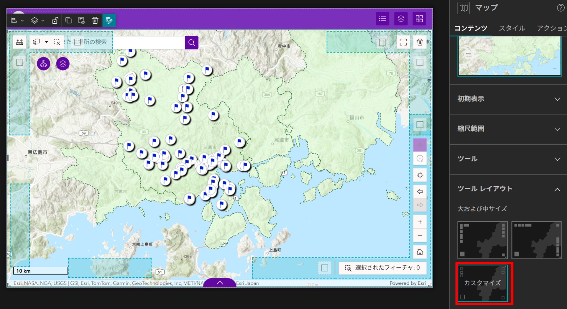 また、マップ ウィジェット内のツールを柔軟に配置できるカスタマイズ レイアウトが追加されました。画面の四隅に表示される青枠内で、ツールをドラッグ & ドロップすることでボタンの配置を調整できます。