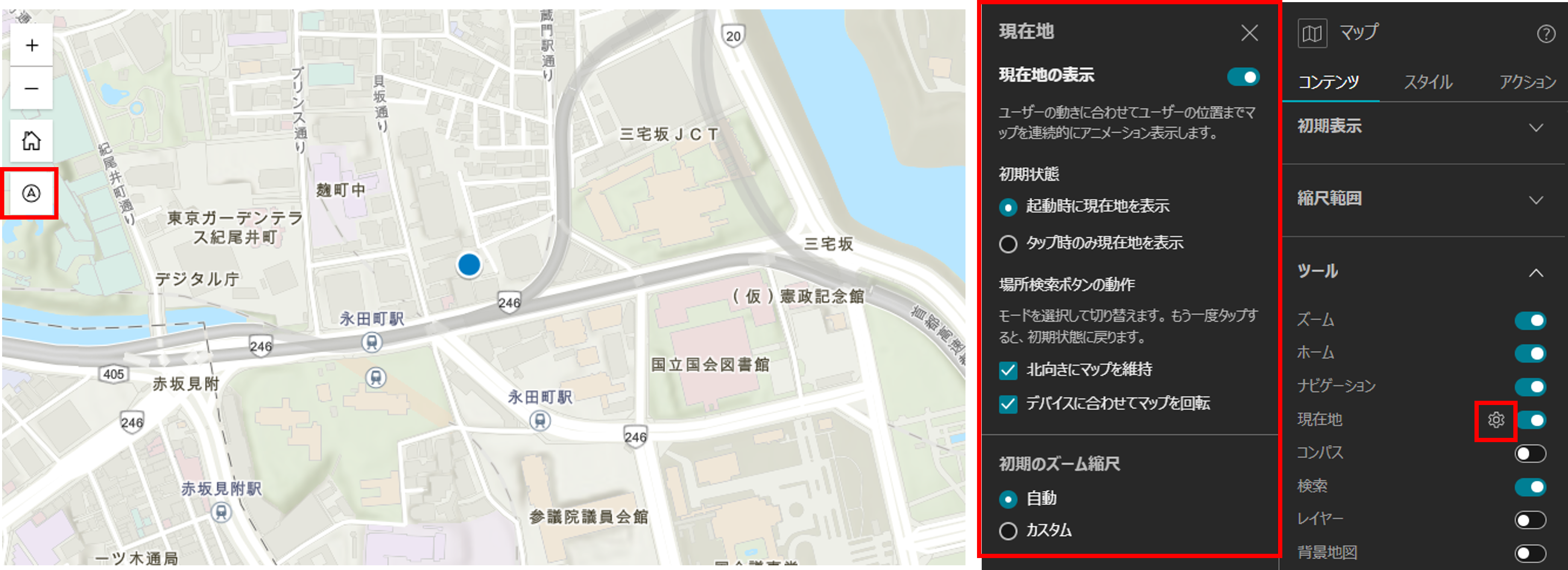 マップ ウィジェットでは、[現在地] ツールに [現在地の表示] オプションが追加されたとともに、[現在地] ボタンをタップする際の詳細な設定も構成できるようになりました。