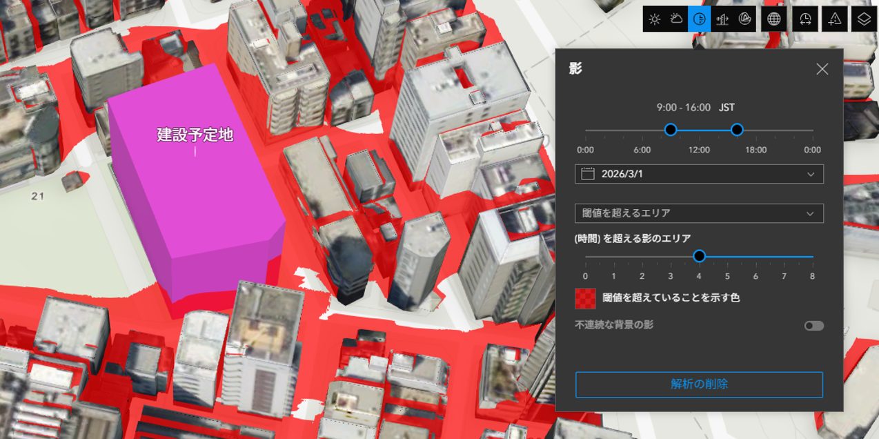 建物の高さや配置によって発生する日影を事前にシミュレーションすることで、