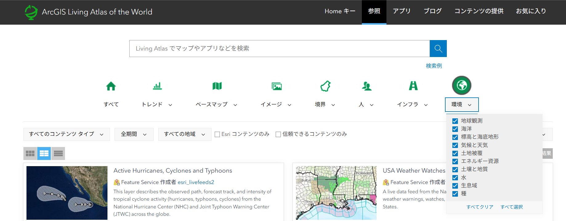 Living Atlas の「環境 (Environment)」分野では、以下のような幅広いテーマをカバーするレイヤーが提供されています。