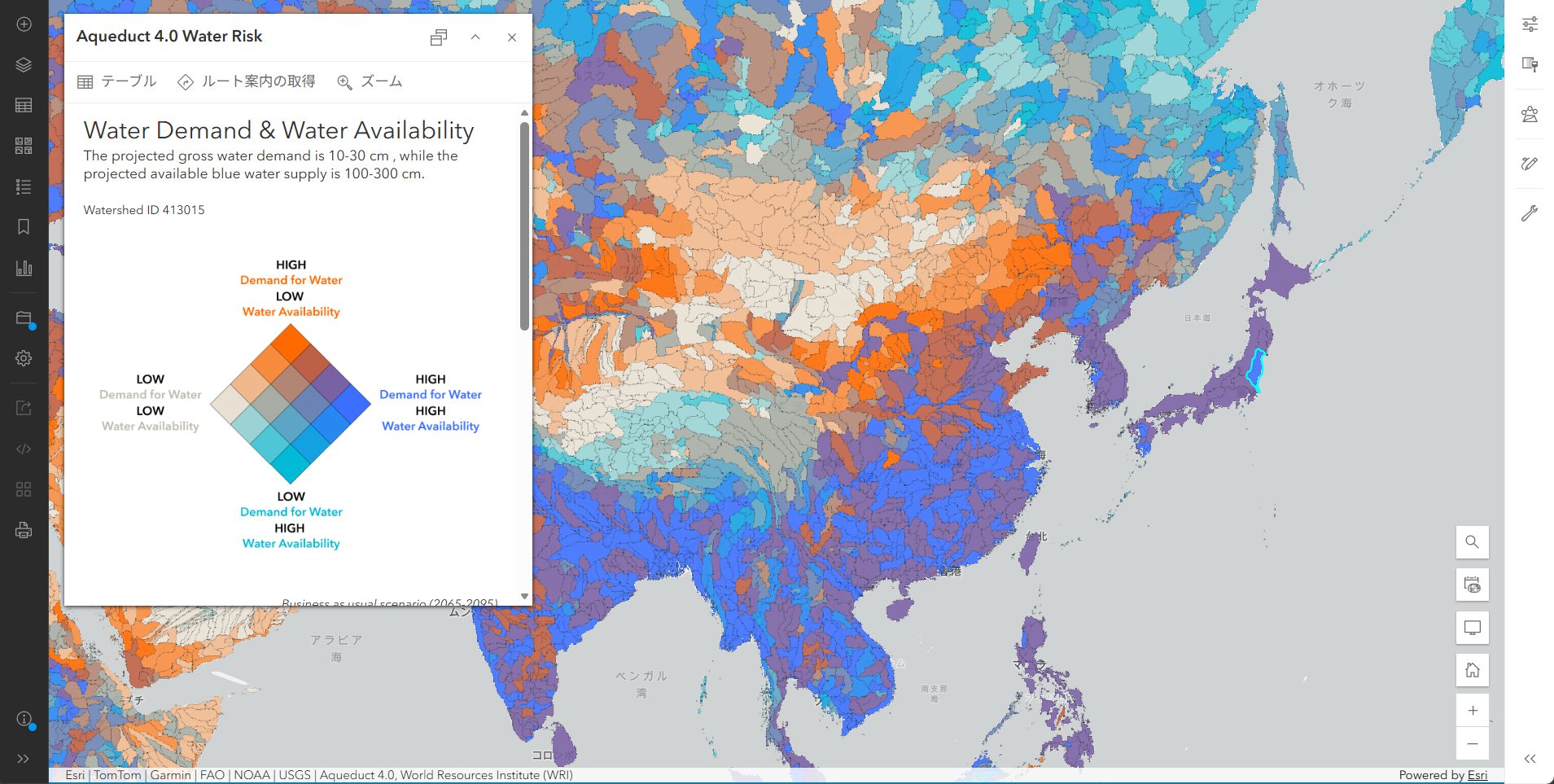 - WRI Aqueduct Water Risk: https://livingatlas.arcgis.com/ja/browse/#d=2&q=Aqueduct