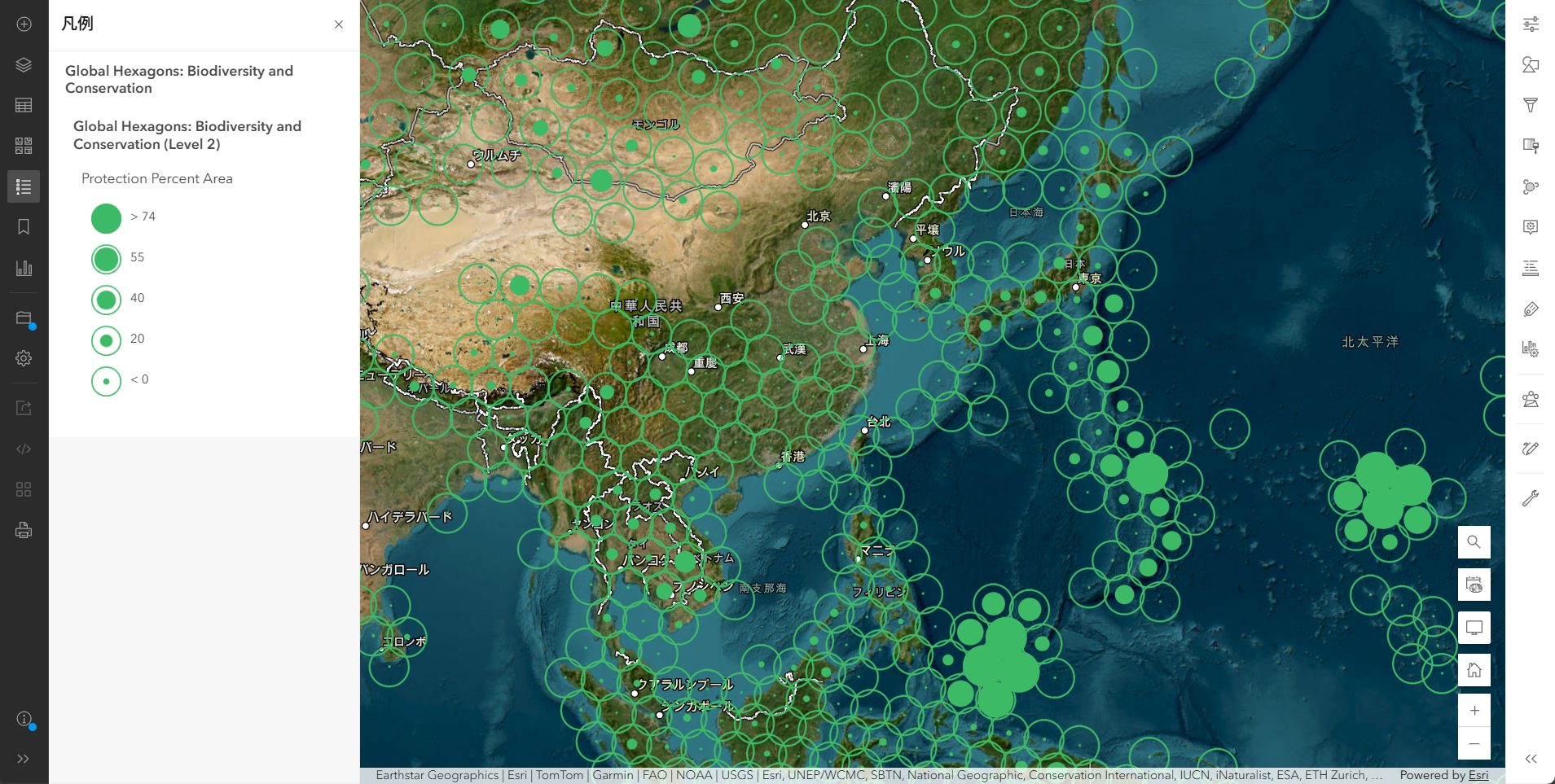 近年注目されている Global Hexagons (H3) は、均一な六角形グリッドを用いることで、生物多様性や土地利用、炭素、人口など、性質の異なる環境データを同一単位で統合・比較できる仕組みです。Living Atlas では、20 以上の主要環境データを H3 グリッドに集約し、複数スケールでの分析を可能にしたデータを提供しています。詳細については、Esri 社のブログ:Introducing Global Biodiversity and Conservation Hexagons (英語) をご確認ください。