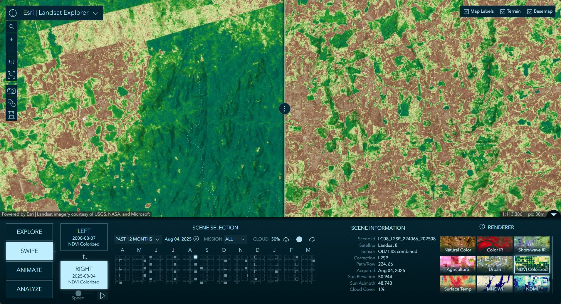 ブラジルの一部エリアにおける 2000 年 8 月 (左) と 2025 年 8 月 (右) の NDVI 画像の比較。2000 年では緑色だったエリアが 2025 年には大半が茶色になり、植生が大きく減少していることが分かる (使用アプリ: Landsat Explorer)