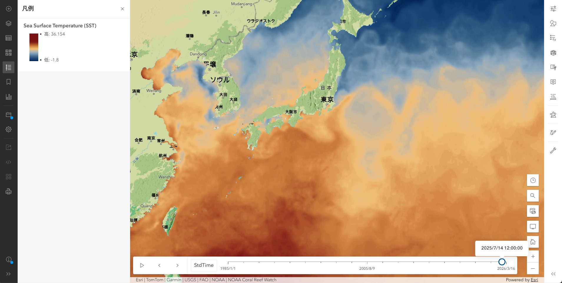 - NOAA Sea Surface Temperature: https://livingatlas.arcgis.com/ja/browse/#d=2&q=Sea%20Surface%20Temperature