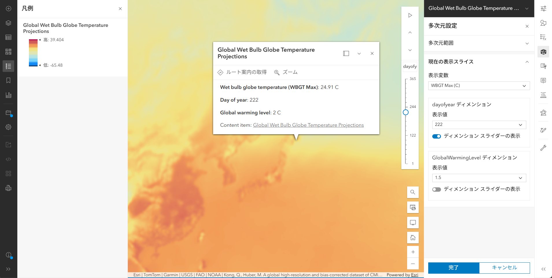 WBGT (湿球黒球温度) は、気温・湿度・日射・風の影響を統合した暑熱ストレス指標で、熱中症リスク評価や屋外作業、都市環境における気候変動適応策の検討に利用されます。Global Wet Bulb Globe Temperature Projections レイヤーは、CMIP6 の複数気候モデルと ERA5 再解析を用いて作成された、全球の WBGT 予測データです。また、リアルタイムな WBGT データとして、環境省の「熱中症予防情報サイト」で公開されている暑さ指数をもとに ESRIジャパンが加工・提供しているデータもありますが、2026 年 4 月時点では、同サイトの運用終了に伴い更新を停止しています。