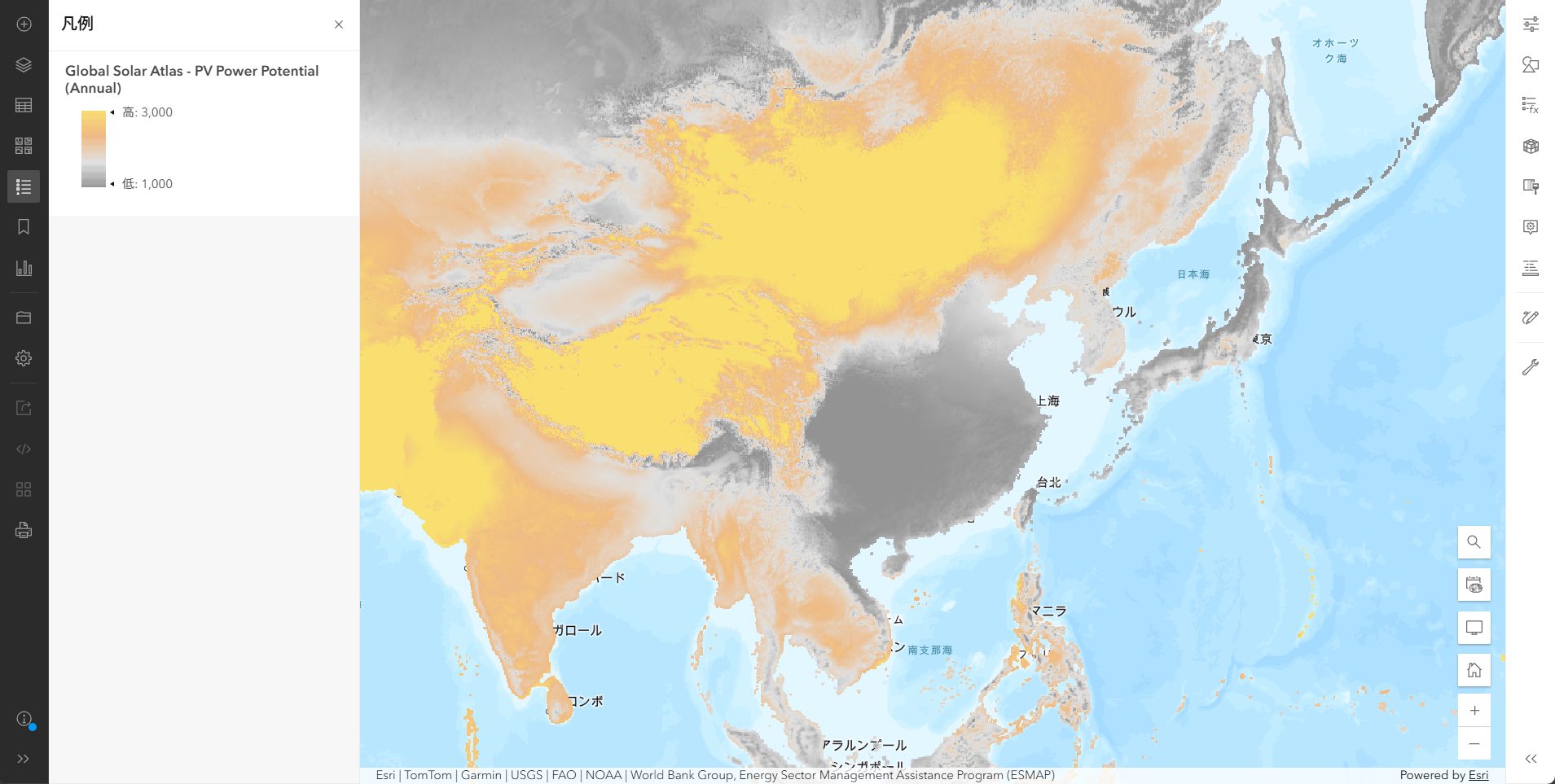 - Global Solar Atlas: https://livingatlas.arcgis.com/ja/browse/#d=2&q=Global%20Solar%20Atlas