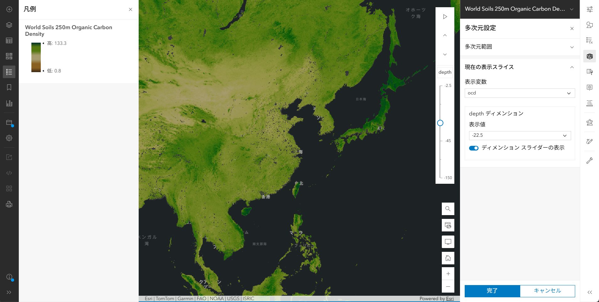 深さ 15-30cm における土壌中の有機炭素密度 (使用レイヤー:World Soils 250m Organic Carbon Density)